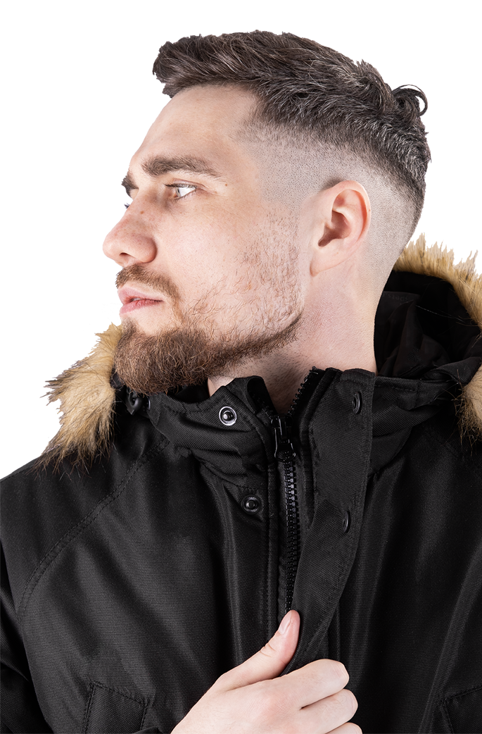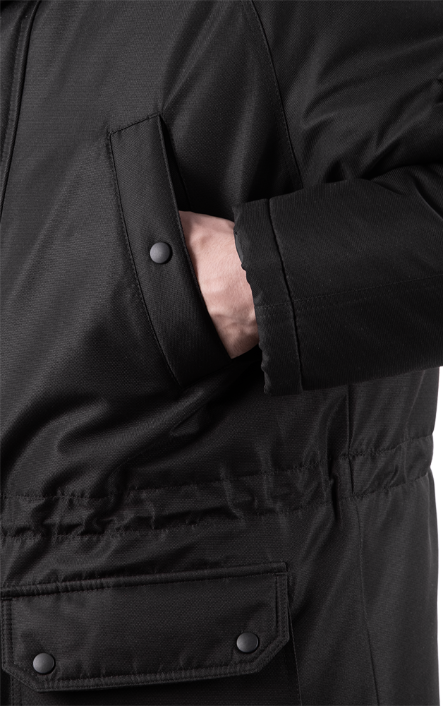 • капюшон с регулировкой объёма и съёмной меховой опушкой