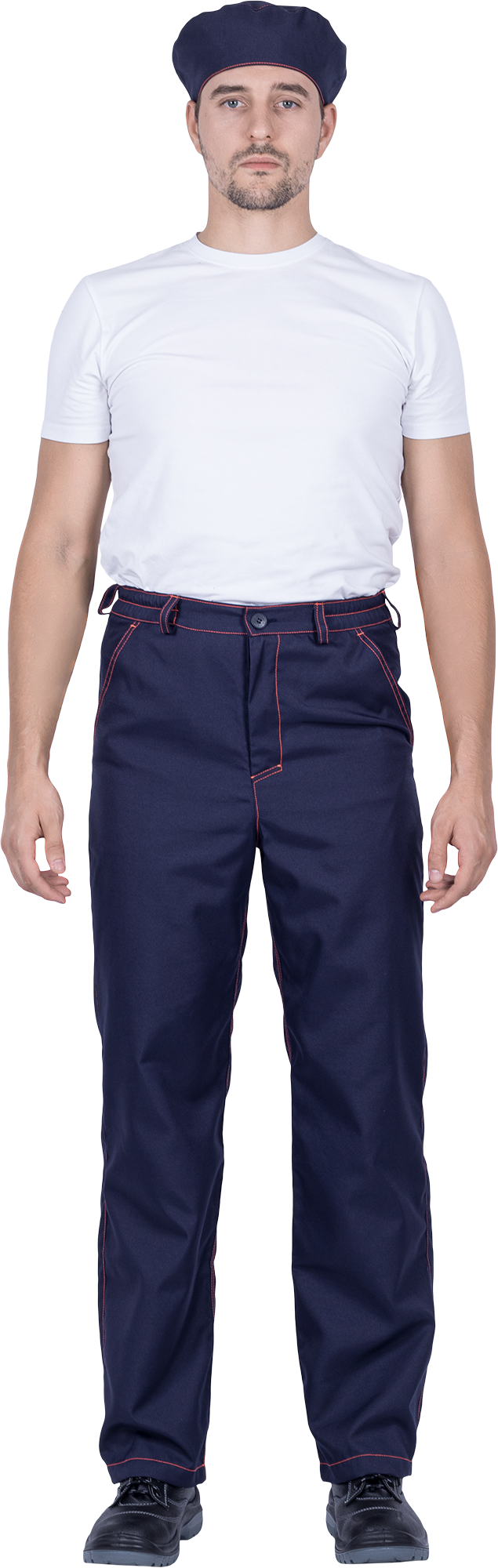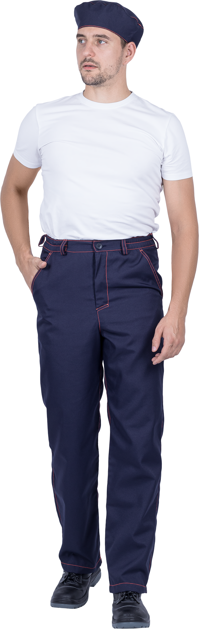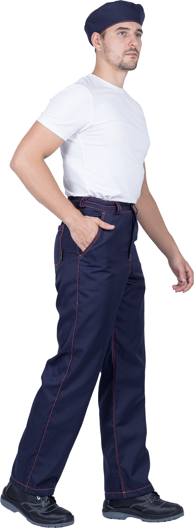 Костюм состоит из куртки, брюк и берета. Костюм с отделочными строчками контрастного цвета.